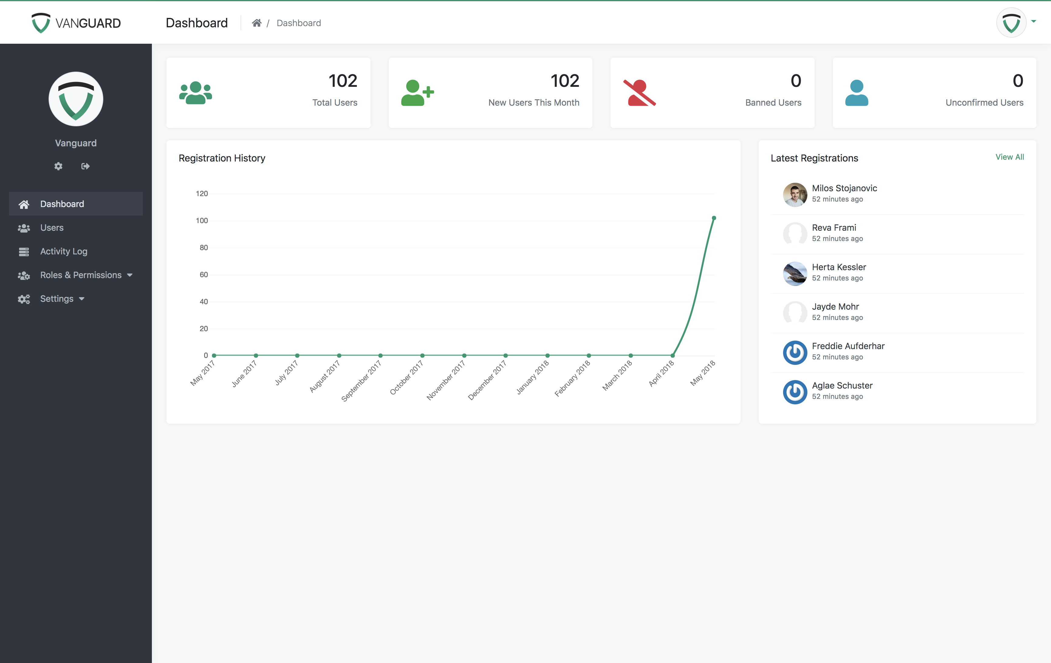 Administrators are able to see some system stats on their dashboard page. They can see how many new users are registered for current month, number of total users, number of banned users and number of users who still have to confirm their email address.